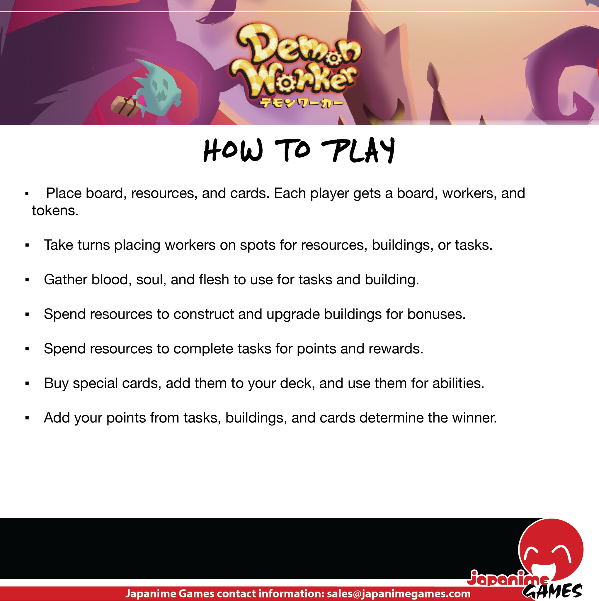 The seat of the Demon King is empty and the next candidate for the throne must show the world their ability to rule. Scout for competent demons, efficiently gather sacrifices, mass produce weapons, promote the research of magical stones, and execute evil and sinister plans! Includes rules in English, French, Spanish, German and Italian!<