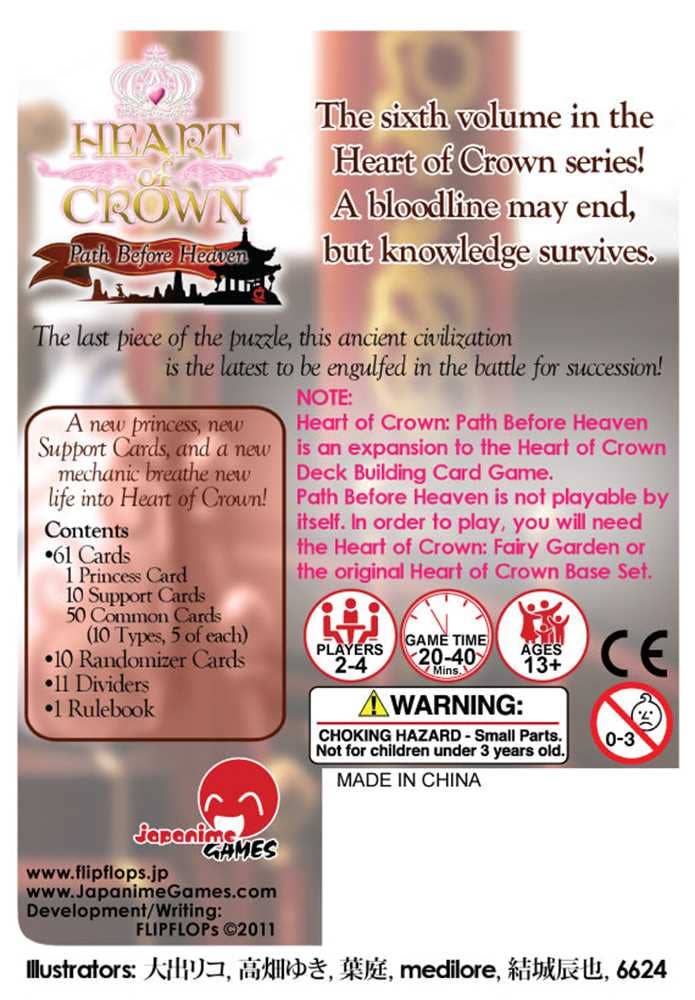 Add to your Heart of Crown collection with this new expansion! Requires a base boardgame to play (original Heart of Crown or Fairy Garden). 1 New Princess (Princess of the Ancient Dynasty Ru Li) 10 Randomizer Cards 11 Dividers 10 Support Cards 10 new Commons Rulebook