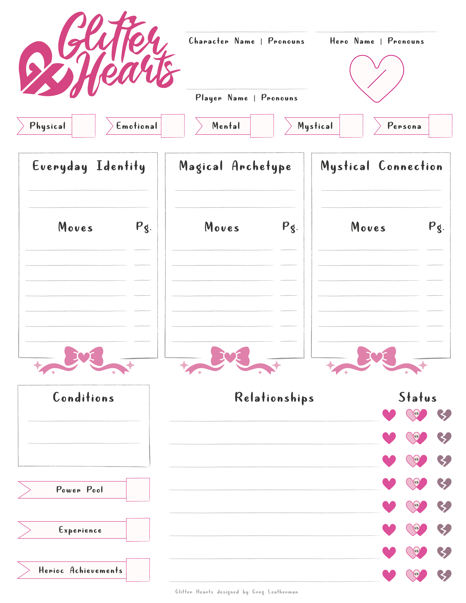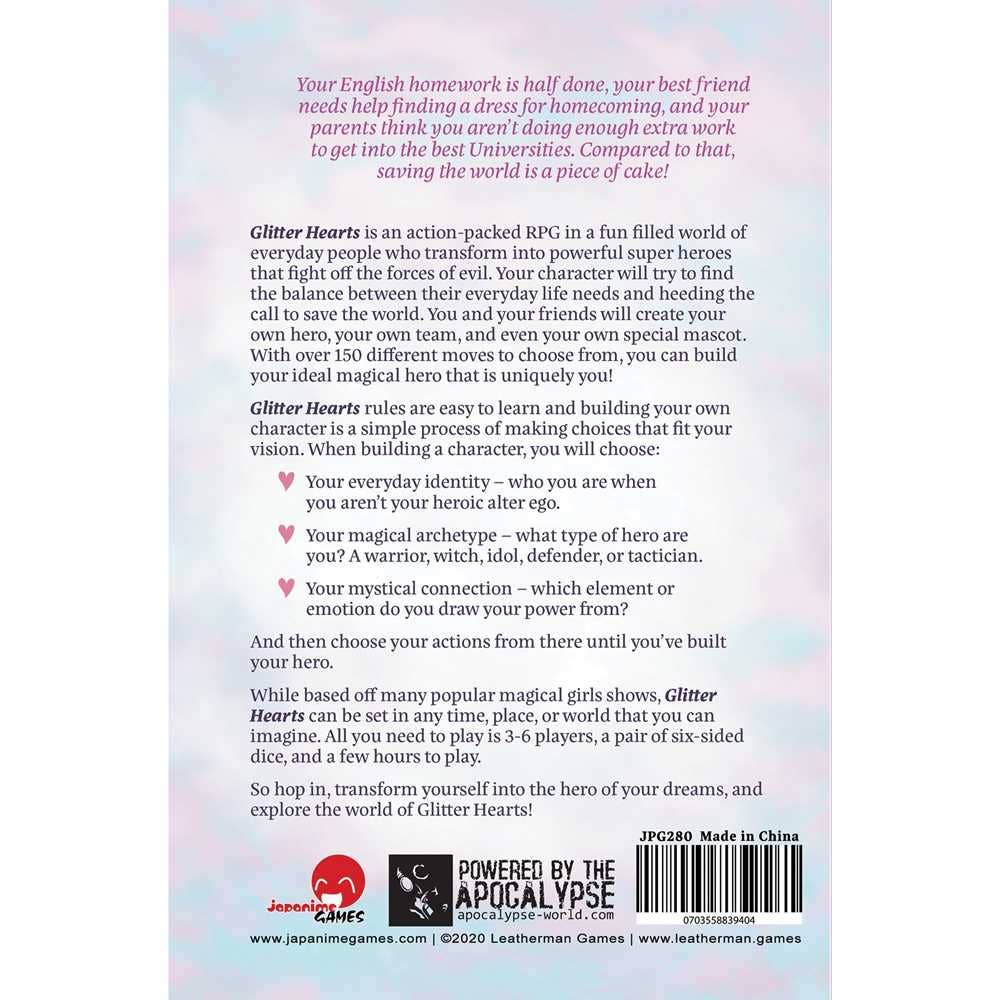 Your English homework is half done, your best friend needs help finding a dress for homecoming, and your parents think you aren’t doing enough extra work to get into the best Universities. Compared to that, saving the world is a piece of cake! Glitter Hearts is an action-packed RPG in a fun filled world of everyday people who transform into powerful super heroes that fight off the forces of evil. Your character will try to find the balance between their everyday life needs and heeding the call to save the world. You and your friends will create your own hero, your own team, and even your own special mascot. With over 150 different moves to choose from, you can build your ideal magical hero that is uniquely you! Glitter Hearts can be set up in minutes! All you need to play is 3-6 players, a pair of six-sided dice, and a few hours to play.